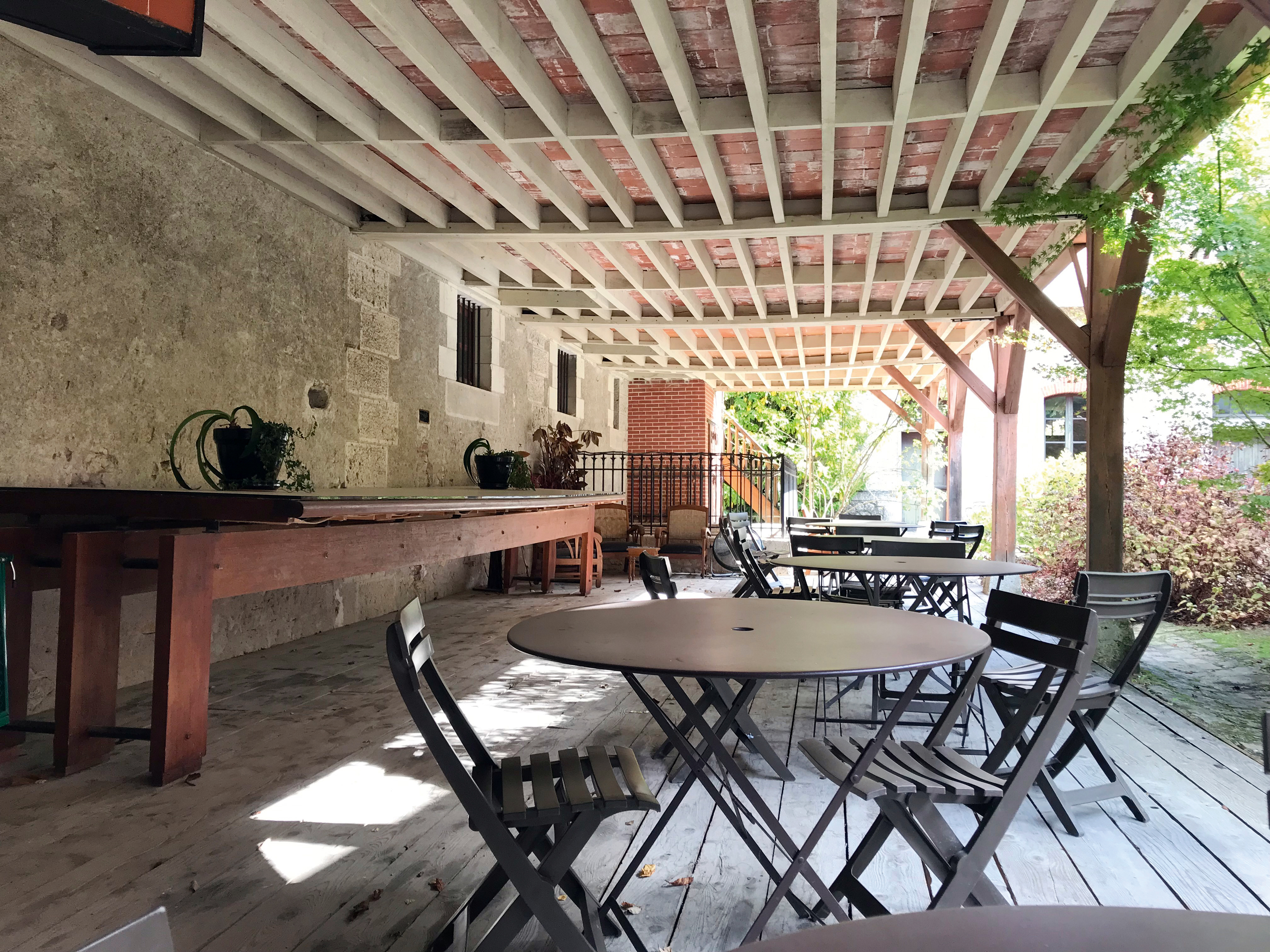 Il fait un temps magnifique, un temps à ne pas rester enfermé. Qu’à cela ne tienne : l’Espace du Séchoir peut accueillir débriefings et brainstormings endiablés ! Sur cette terrasse couverte à l’abri des rayons du soleil, il est possible de travailler assis à une trentaine et de boire un verre à bien plus.
