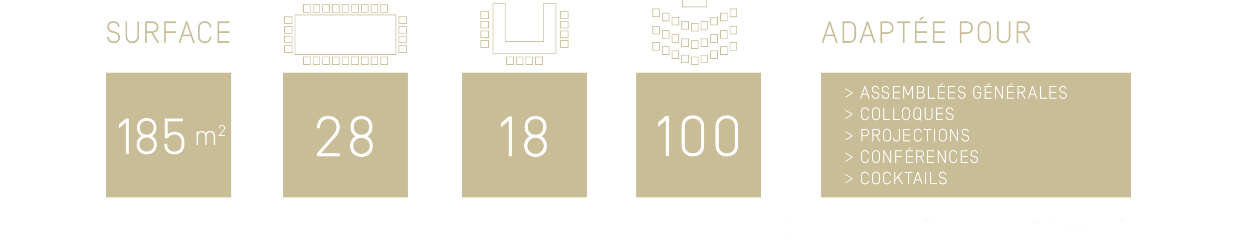 Située dans la Cour de la Ferme, cette salle peut accueillir jusqu’à 100 personnes assises dans ses 185 m2.
