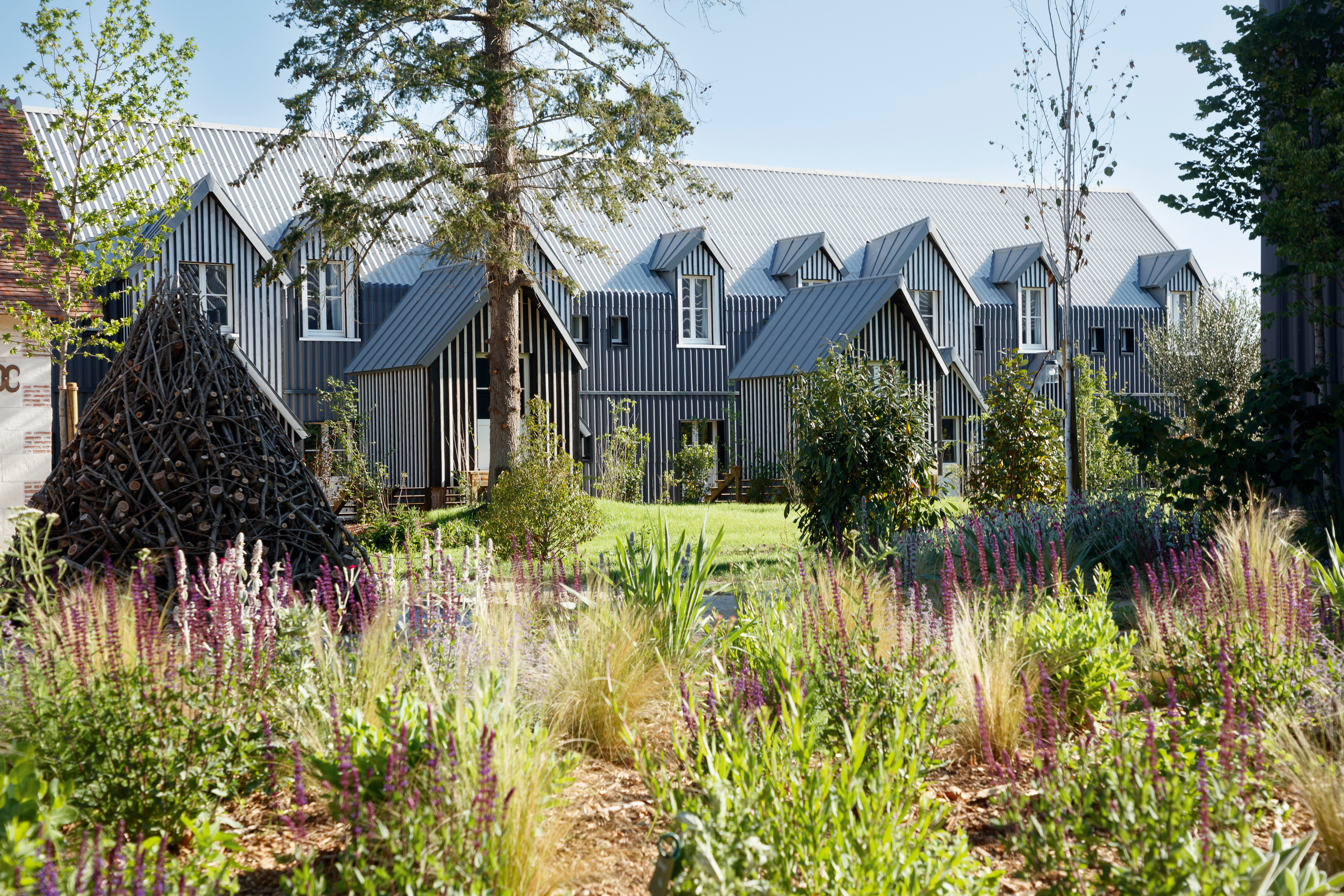 Intégré dans le paysage, Le Bois des Chambres compte 39 chambres, un restaurant de 50 couverts avec une terrasse donnant sur une pièce d’eau, et deux espaces polyvalents. Ses jardins sont multiples, étroits et longs, comme issus des divisions successives d’une parcelle agricole. Délimités par des haies ou des allées d’arbres en espalier, ils accueillent des cultures maraîchères comme des champs de fleurs ou des espaces réservés aux aromates. Lieu de vie et de ressourcement entouré de nature, Le Bois des Chambres conjugue l’inventivité des formes, qu’elles s’appliquent au confort du séjour, aux services proposés ou au respect de l’environnement.