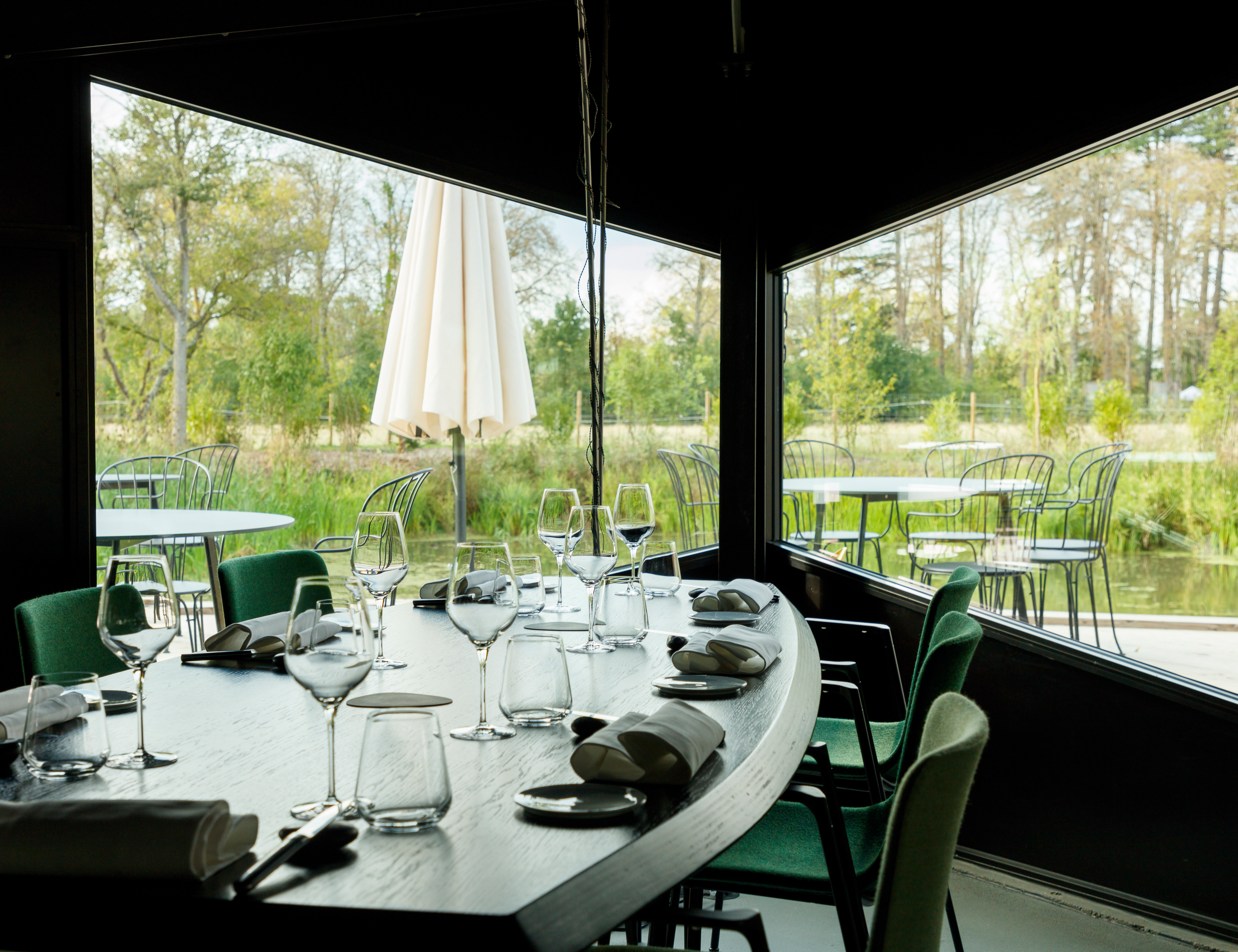 Installé sur l’emplacement de l’ancienne maison d’habitation de la ferme, le restaurant accueille les amateurs de gastronomie fine et authentique dans une architecture et un décor inattendus. Inspirée à la fois des tourelles des châteaux de la Renaissance et des meules de foin des campagnes, une immense fleur de chaume abrite une série d’espaces ouverts sur la terrasse de l’étang, la cour de la ferme ou simplement sur le paysage.