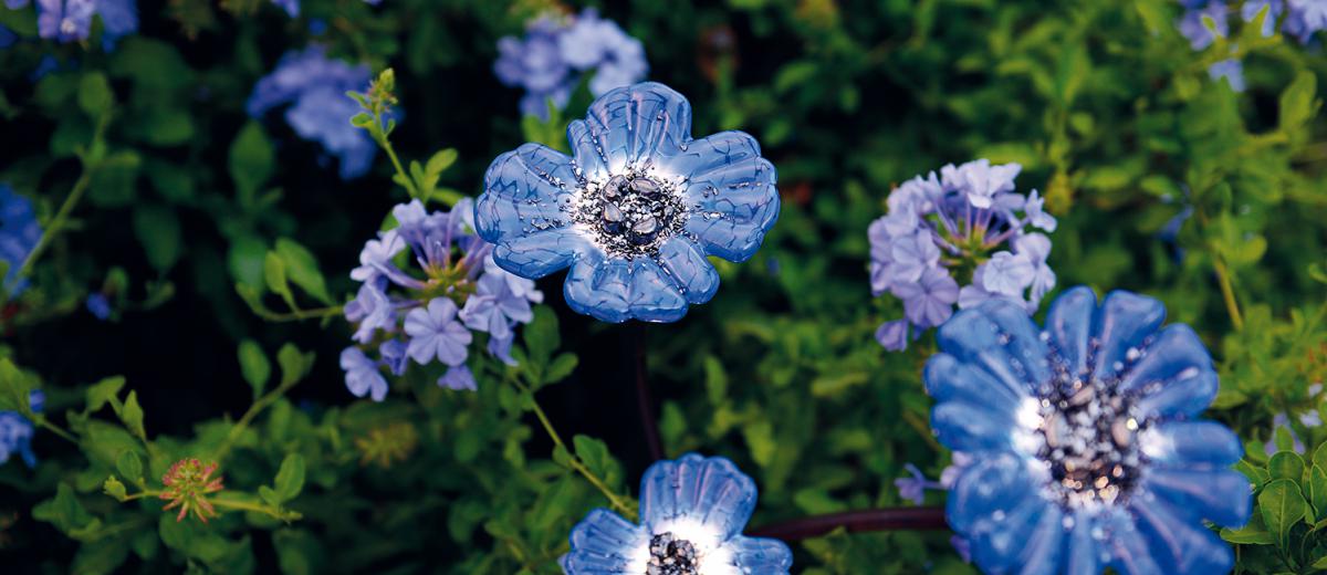 Als Schaffer von einzigartigen, poetischen Werken, die dem Charakter der Orte, die er in Beschlag nimmt, entsprechen, erfindet Jean-Philippe Weimer subtile, helle Werke und originelle Szenografien. Im großen tropischen Gewächshaus des Wirtschaftshofs sät er seine zarten blauen Blumen aus.