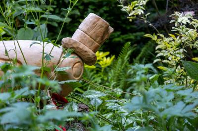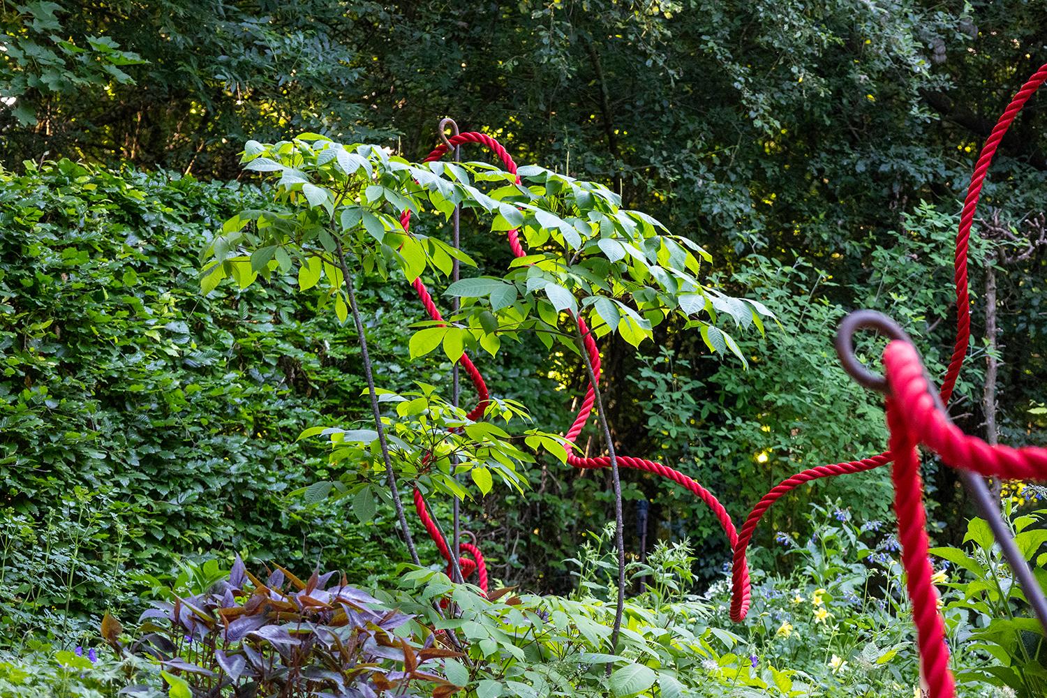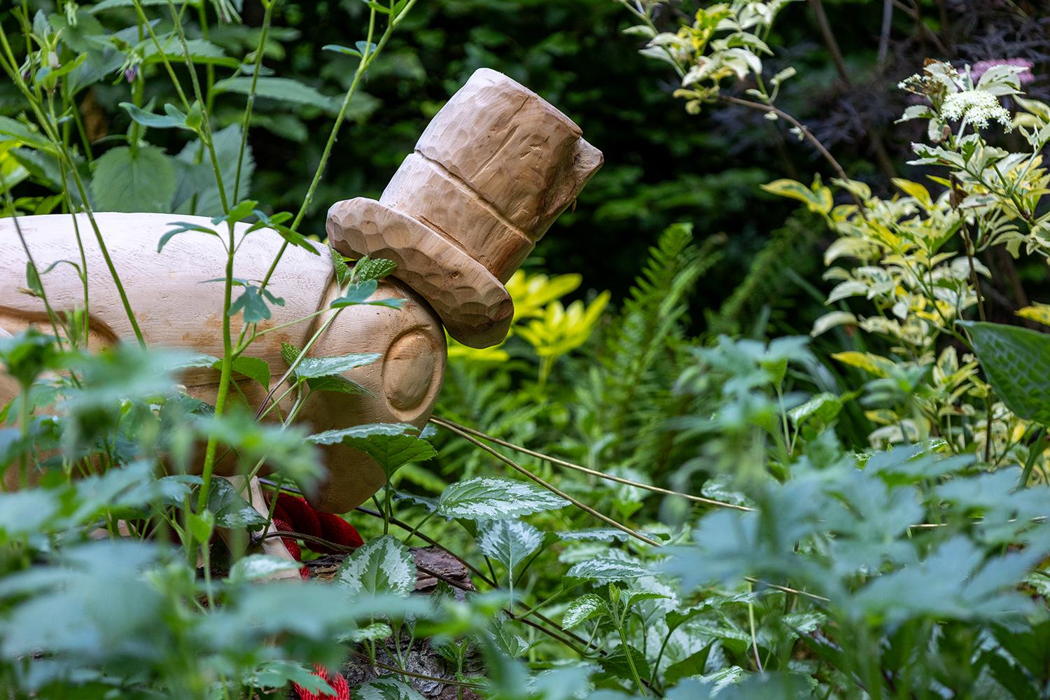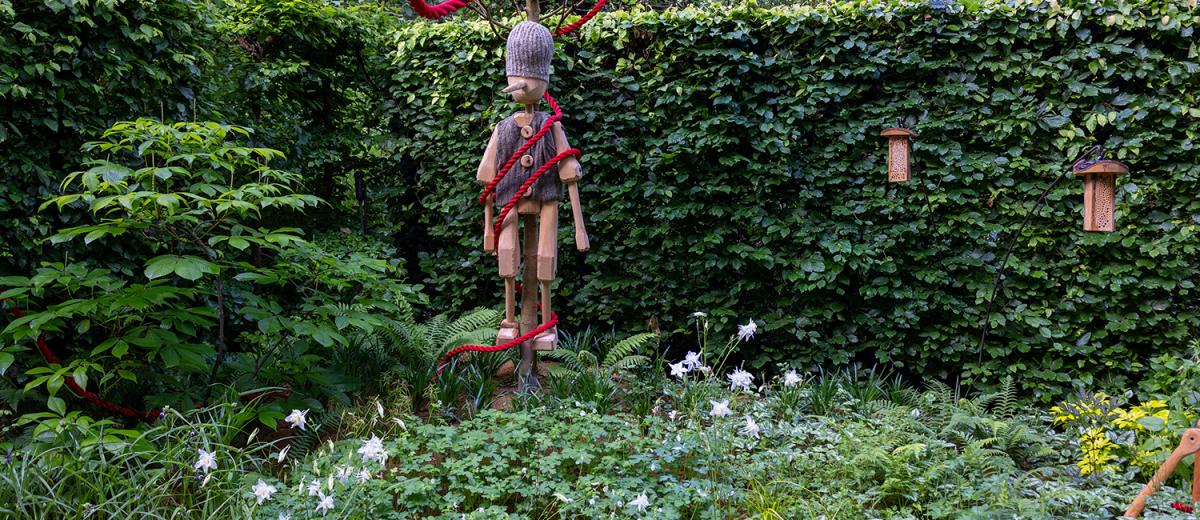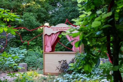 In the garden, a red rope, winding between the different episodes, represents the thread of the story. It crosses the Field of Miracles, where images of modern-day fake myths are shown. It leads to a small theatre, where you can choose to be spectator or puppet. It weaves between mirrors in which, as visitors, we can see our reflections, raising questions about our own role in the world. After a while, the red rope, which bound the puppet to fleeting ideals, is broken. The stones placed beside the path reveal messages about nature, cooperation and living frugally - the riches that make us real people.