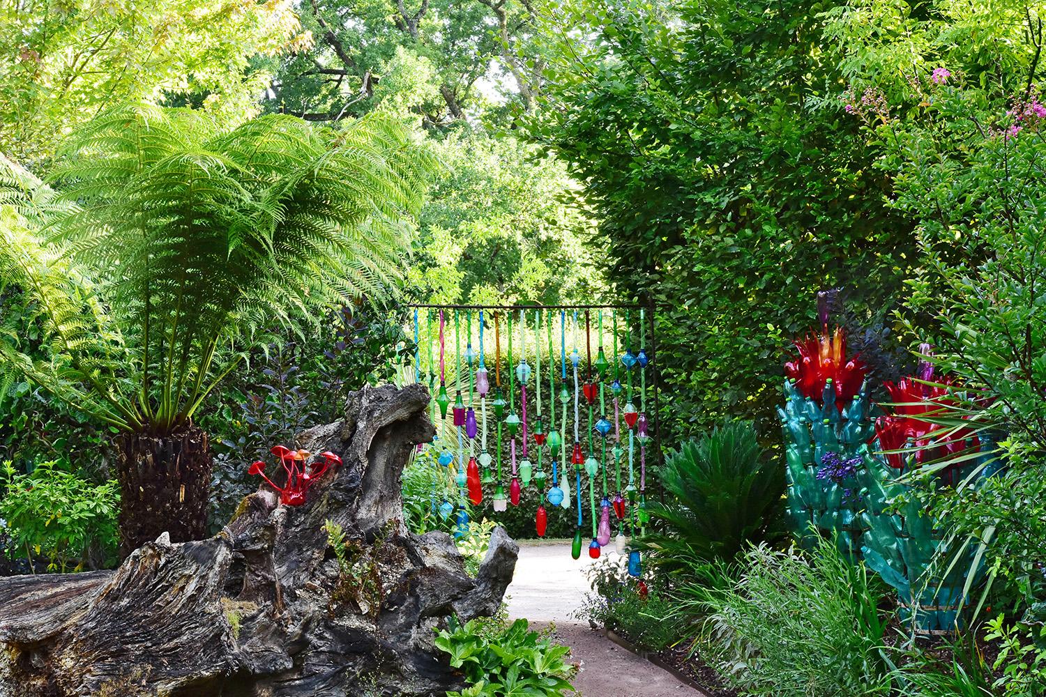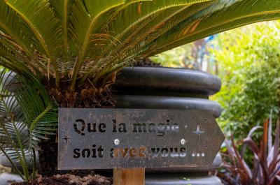 The words that wizards utter before casting a spell, “hocus pocus”, lend themselves very neatly here to the garden, “hortus” in Latin, with a slight tweak of the first word. Visiting it, amidst planted deliriums and recycled follies, is a heady, invigorating and intriguing experience. Through a multicoloured door curtain, a new world opens up, where childlike naivety teams up with the power of botany and where the sovereign plant kingdom lords over polymer sequins. A thousand-and-one shades of green unfold in this cabinet of poetic curiosities, a far cry from our day-to-day.