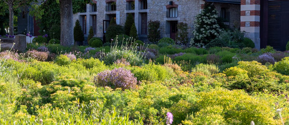 Las plantaciones de James Basson juegan con una paleta que a menudo se limita a tres especies dominantes. Las plantas de hoja perenne alternan con las gramíneas y las plantas coloridas como la Lomelosia rastrera, la Phlomis de flores doradas o la Euphorbia arbórea. Estas plantas son particularmente resistentes. Su preferencia es el lentisco de garrigas y monte bajo. Todas estas plantas atraen a los polinizadores y a la fauna.