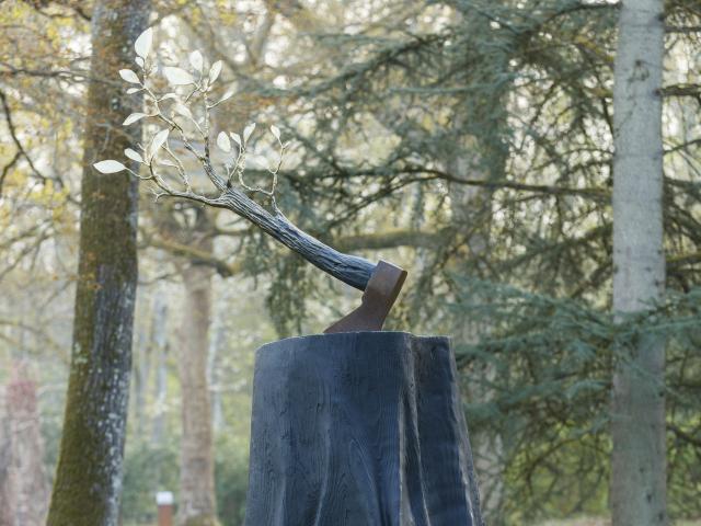 Non loin de là, Ghyslain Bertholon introduit un récit fantastique dans le Parc historique et surprend notre regard. Quelle est donc cette histoire d’arbre tué par une hache, d’où renaissent des feuilles d’or ? Intrigante, l’œuvre, noire, active le paysage et engage le visiteur dans une attention renouvelée aux forces qui traversent la nature.