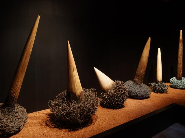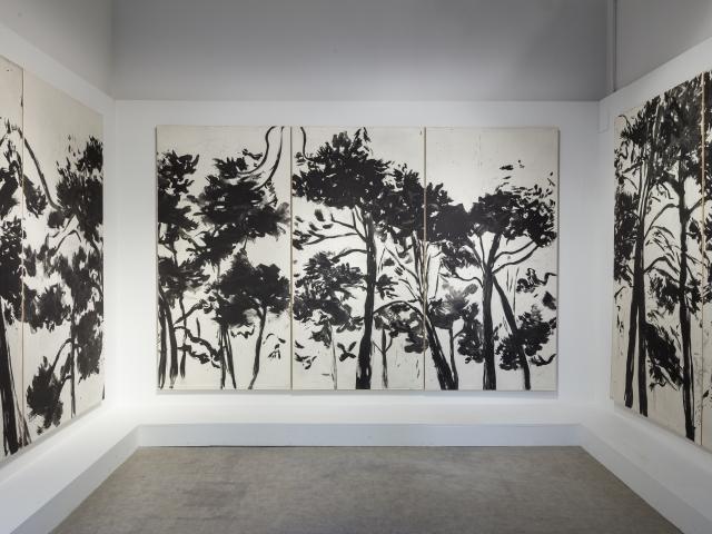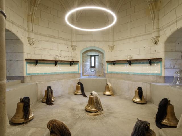 Marc Desgrandchamps donne le ton. Dans les Galeries Hautes du Château, ses peintures ouvrent sur des paysages traversés, fragmentés, où des troncs noirs se détachent sur des fonds bleutés, comme suspendus dans le temps. Le bleu y installe une distance, une atmosphère onirique et propice à l’errance du regard. Il devient un horizon mental, un lieu de passage où le visible semble toujours sur le point de se dissoudre au profit d’un ailleurs. Non loin de là, Claudio Parmiggiani propose un tout autre rapport à la couleur. Ses bibliothèques réalisées à la suie et à la fumée ne montrent que des traces : silhouettes de livres absents, rayonnages fantômes, images de ce qui n’est plus. Ces œuvres proposent une réflexion sur la connaissance, l’oubli et tout ce qui s’enfuit, inexorablement. Non loin de là, les sculptures arachnéennes de l’artiste Antonio Crespo Foix, faites de fibres et de fils viennent dialoguer avec les mobiliers précieux du Petit Salon. La Tour de Diane, quant à elle, se fait lieu de recueillement. Pascal Convert y installe une œuvre mystérieuse qui retient le son autant que la mémoire, tant l’artiste est lié aux figures de l’histoire du lieu. Objet d’appel devenu muet, ces cloches nous parlent de la mort, de l’histoire et de la fragilité humaine. Si bleu il y a ici, c’est au cœur. C’est le bleu de la nuit et du deuil. Dans la Galerie du Porc-Épic, dessins, fusains et sculptures d’Eugène Dodeigne évoquent une recherche obstinée de la forme et du mouvement tant de la figure humaine, que du végétal, toujours exprimée avec force et vulnérabilité. Accueillant le public dans la Cour de la Ferme, une sculpture monumentale du même artiste, oiseau géant de pierre, impose une présence grave et archaïque.