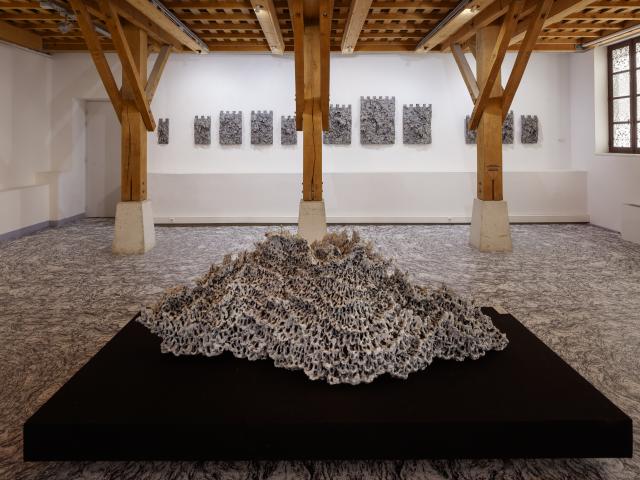 De l’autre côté de la Cour de la Ferme, à l’Asinerie, Anaïs Lelièvre s’intéresse également à la matière et à ses changements d’état. Ses dessins et ses céramiques, d’une extrême précision, évoquent fluctuations et métamorphoses. Spirales, strates et creusements noirs inventent des paysages, tant minéraux qu’organiques, nous conviant à un voyage entre science et poésie.