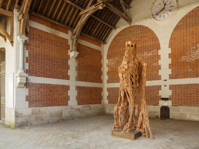 La Galerie des Écuries accueille, pour sa part, des sculptures de Bernard Pagès. Bois, métal, ligatures : ses œuvres se tiennent dans une verticalité fragile et sans emphase, comme si chacune devait négocier son équilibre avec la matière et la gravité. Ces présences sobres et puissantes ancrent la Saison d’art dans une relation directe au sol, au geste, à la construction patiente des formes. À deux pas, l’Auvent des Écuries accueille, en 2026, une chouette de Lionel Sabatté, qui veille en silence sur la Cour, en écho à l’oiseau géant d’Eugène Dodeigne.
