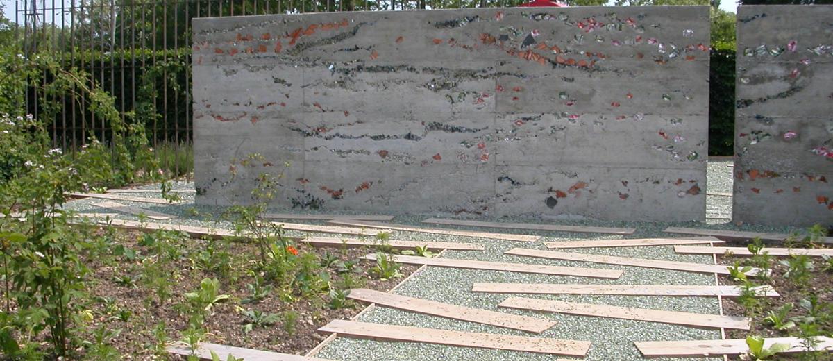 On pénètre dans le jardin par un espace chaotique de plantations mélangées d’annuelles. Espace séduisant, anarchique mais coloré où les tabacs se mêlent aux cosmos, aux cléomes et à des dizaines d’autres plantes. Au sol, des planches permettent de se frayer un chemin. Sur certaines, des mots sont gravés, qui contribuent à la mise en condition de cette promenade initiatique. Et puis soudain, alors que le chemin s’incurve le long d’un mur de résidus de construction, une clôture couverte d’ipomées bleues et blanches conduit le passage à un monde d’harmonie : lavandes sagement alignées, miroir d’eau paisible, sièges disposés sur un sol de verre pilé. Quelques planches où l’on lit les mots harmonie, mesure, linéarité... Avec ses harmonies de blanc et de bleu, ce jardin symbolise parfaitement la recherche de l’équilibre qui fait suite au chaos, l’ordre enfin retrouvé après l’épreuve.