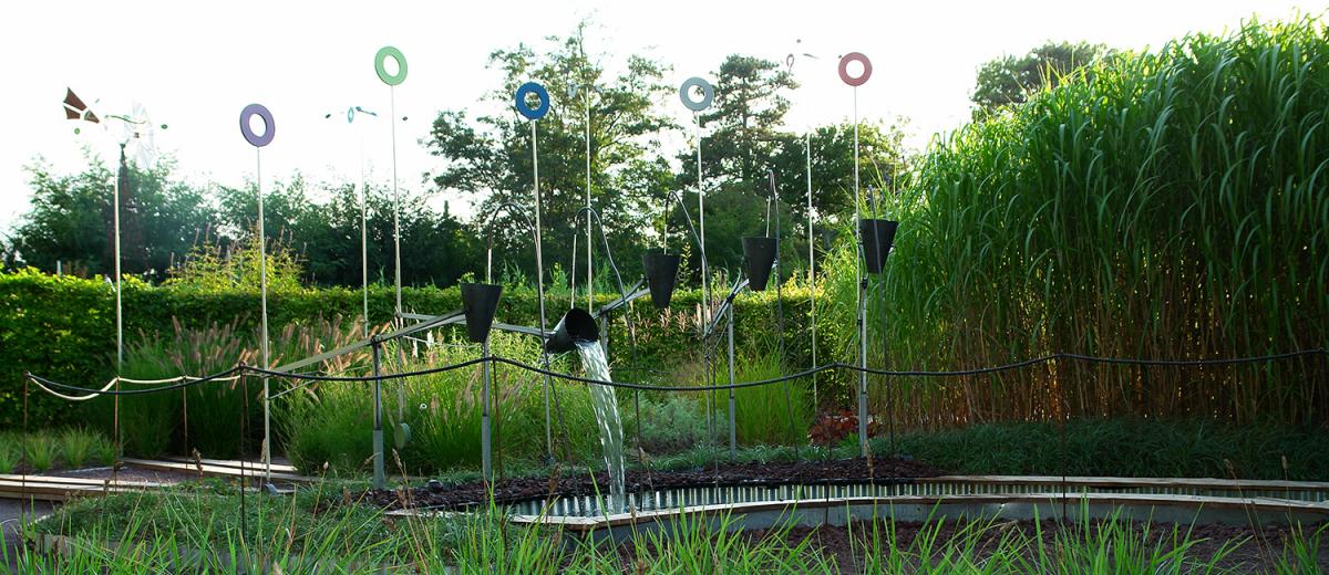 Le jardin décline les couleurs et les éléments. Le mouvement est traduit dans tous ses sens : le balancement du végétal, le tournoiement des éoliennes, le va-et-vient du mécanisme hydraulique, le battement des percussions, l’enroulement des circulations, le rythme changeant du pas, les perspectives évolutives du jardin, le mouvement du sol faisant vaciller les plus curieux.