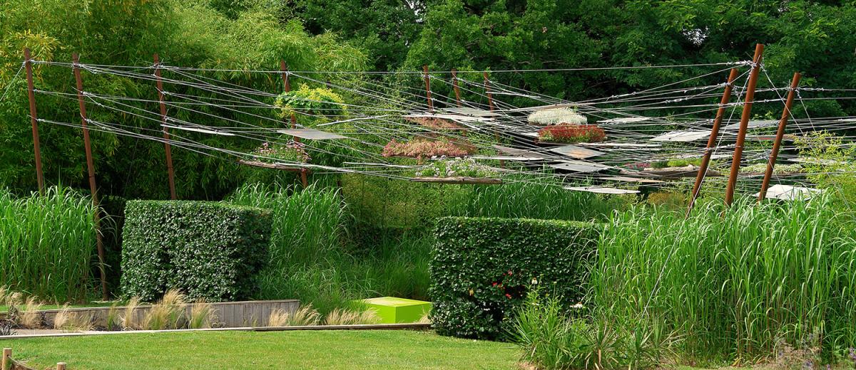 Au sol, le cheminement est laissé sans entrave, offrant une liberté totale de mouvement. Ce jardin est aérien, devenu mobile, léger, vibratile. La nappe suspendue du jardin propose autant de facettes, autant de jardins, ou composantes d’un paysage, qui prennent leur envol. Les ombres et les reflets qu’elle projette sur le sol lui donnent du volume. Au milieu des herbes, quelques "pixels chlorophylle" s’échappent.