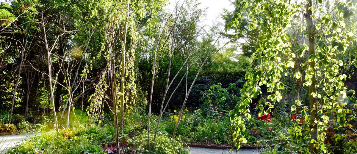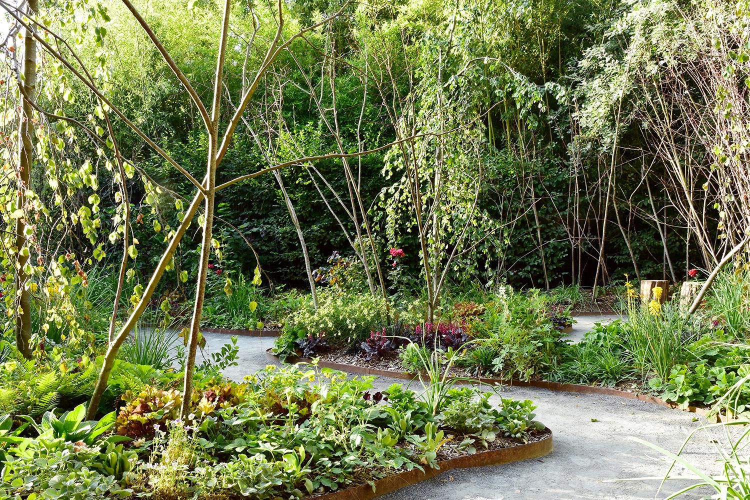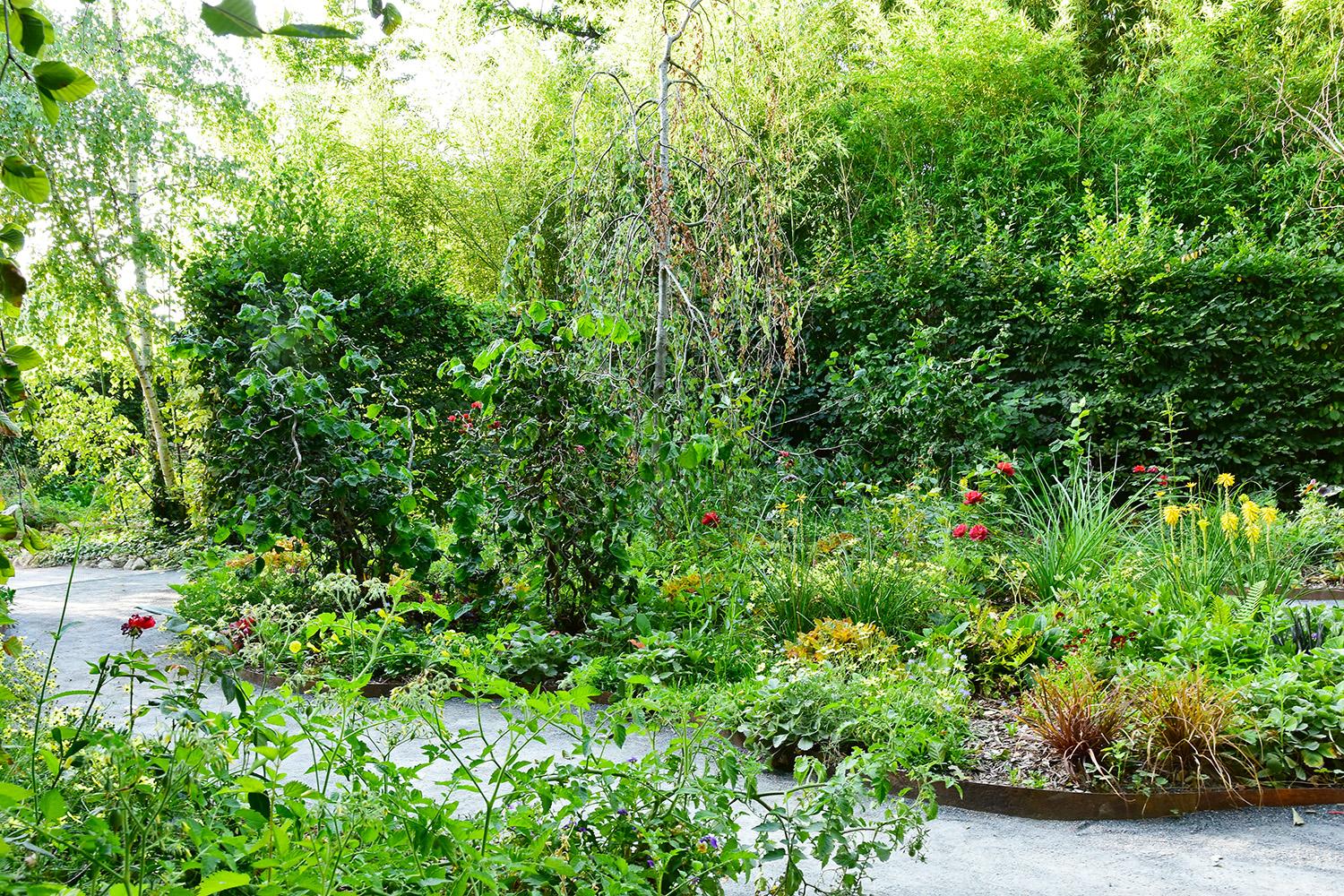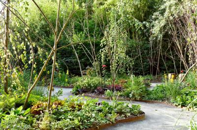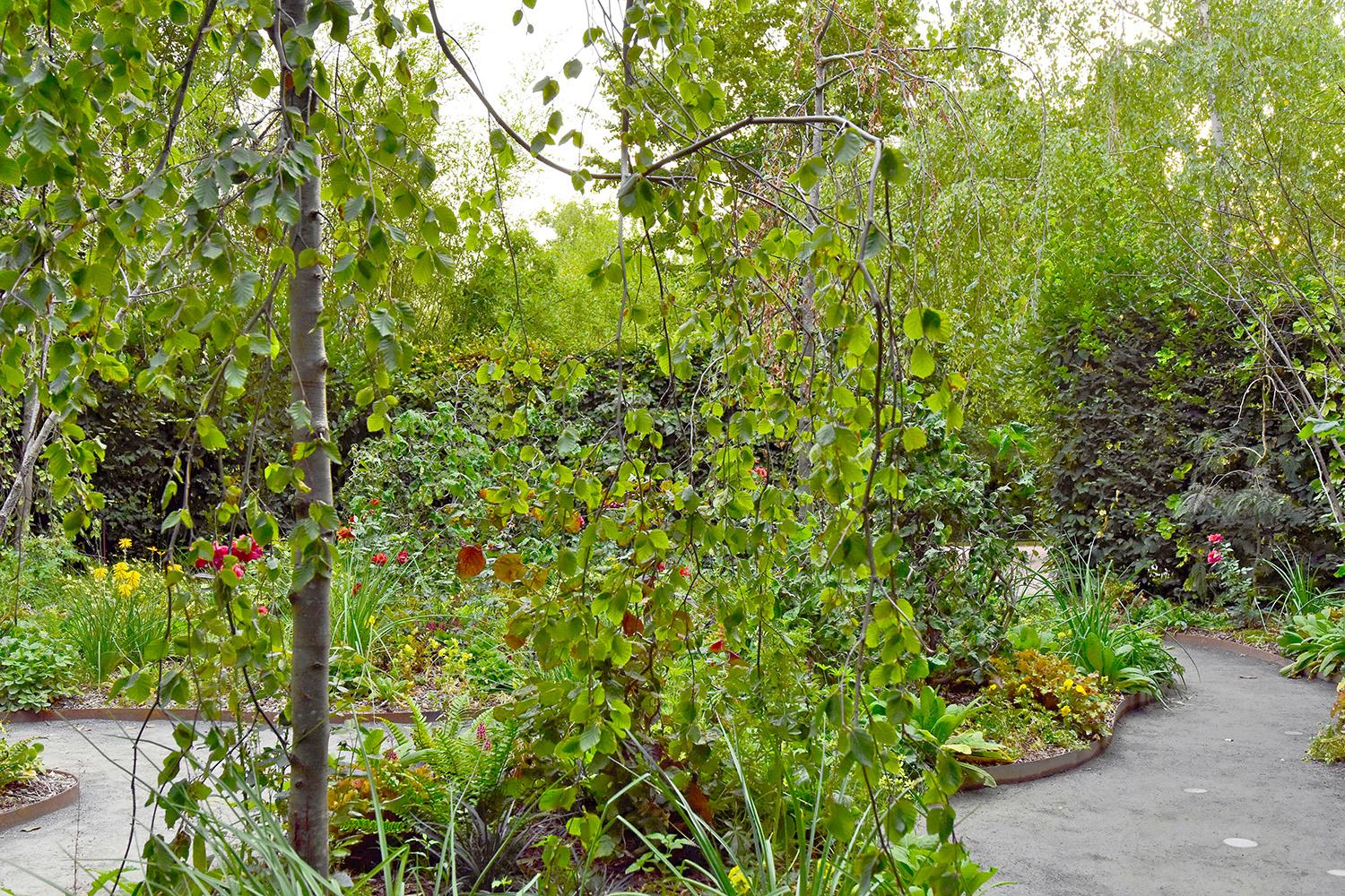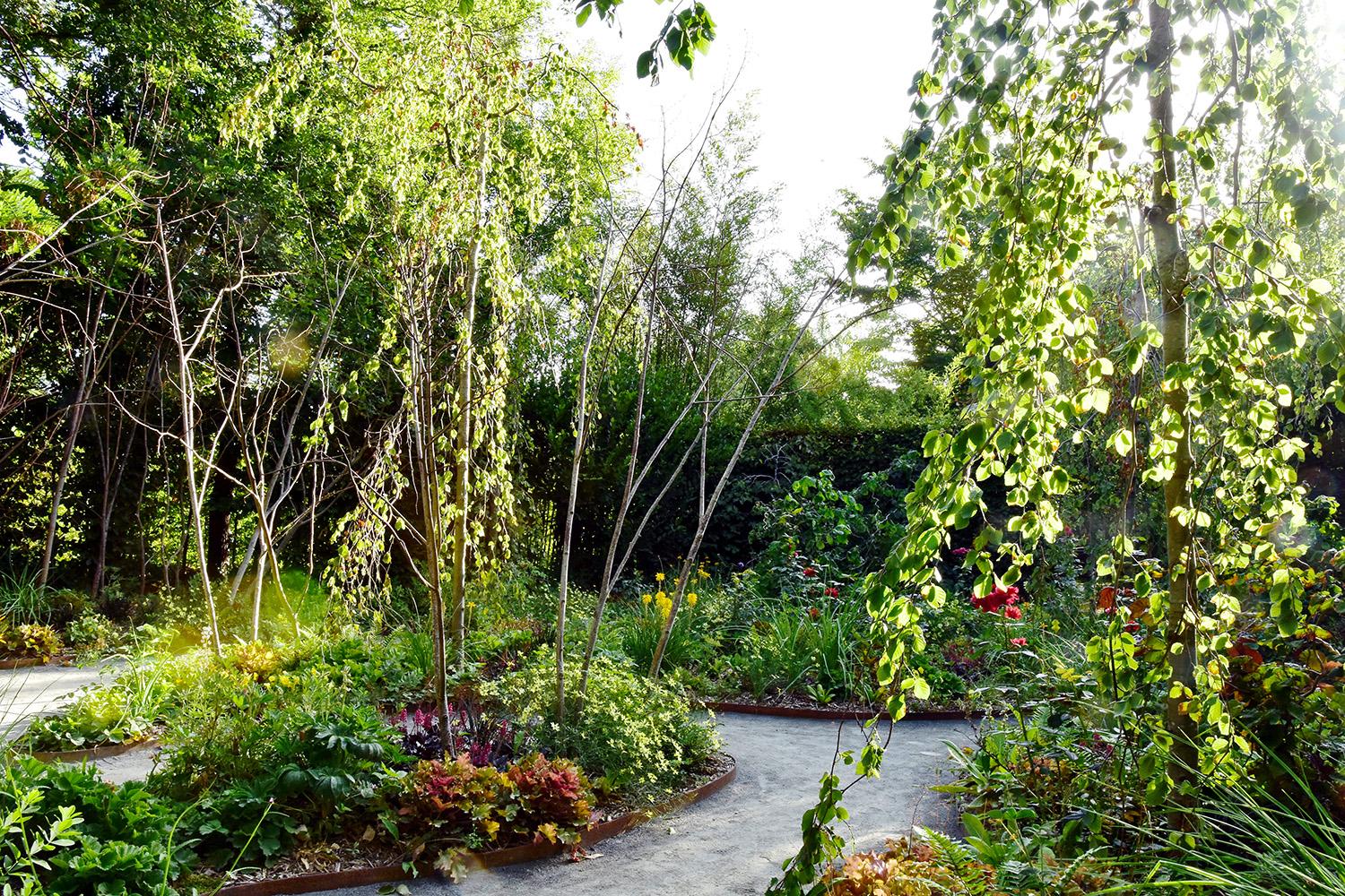 Comme dans un labyrinthe, des chemins sinueux et sombres forment un enchevêtrement d’allées, menant soit à des clairières, soit à des impasses. Chaque détour représente une découverte, un dilemme où les choix mènent à la lumière ou à l’obscurité. Au sol, des incrustations marquent le chemin, telles les miettes du Petit Poucet. Inspirés des étranges faux de Verzy, ces hêtres tortillards qui poussent dans la forêt champenoise, des arbres et des arbustes dressent leurs branches noueuses. Ils évoquent des créatures de contes qui semblent murmurer leurs secrets aux passants. La végétation habite les lieux. Des fraisiers et des rosiers suscitent l’émerveillement et la tentation, tandis que lupins et tritomes se distinguent par leurs fleurs coniques, rappelant les chapeaux des lutins, et que les pensées, avec leurs pétales en forme de petits visages de nains, semblent discrètement nous observer.