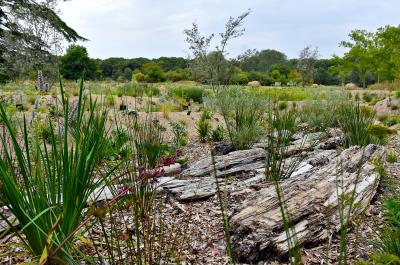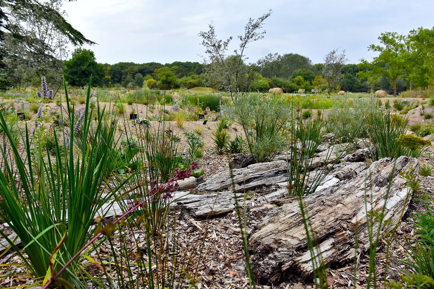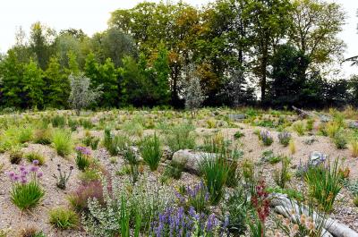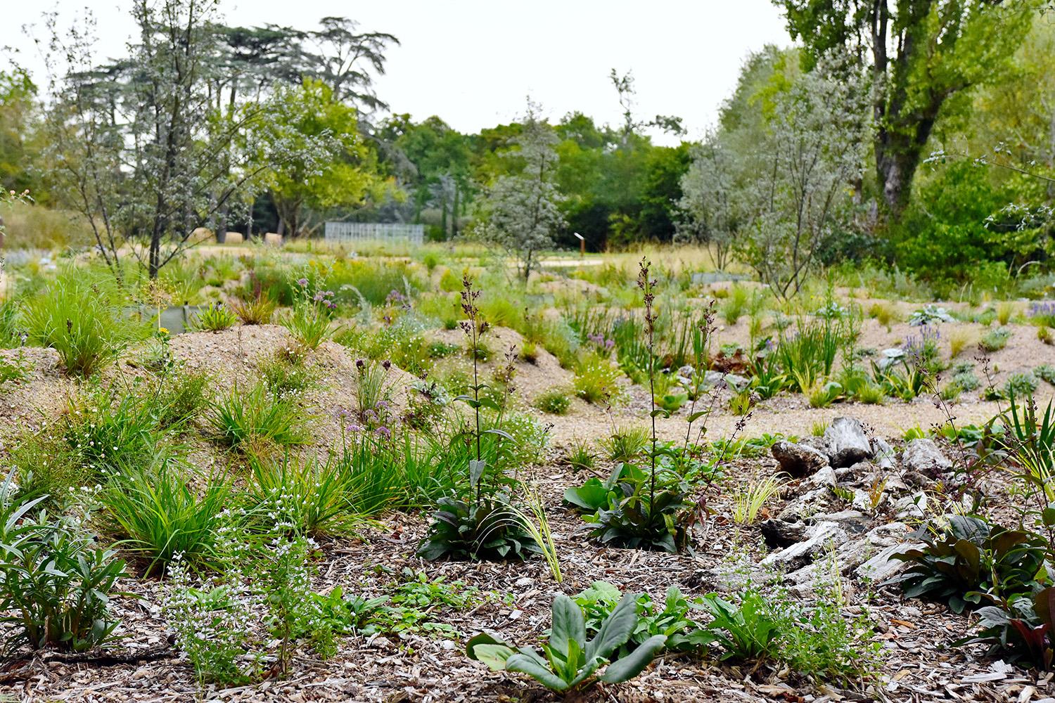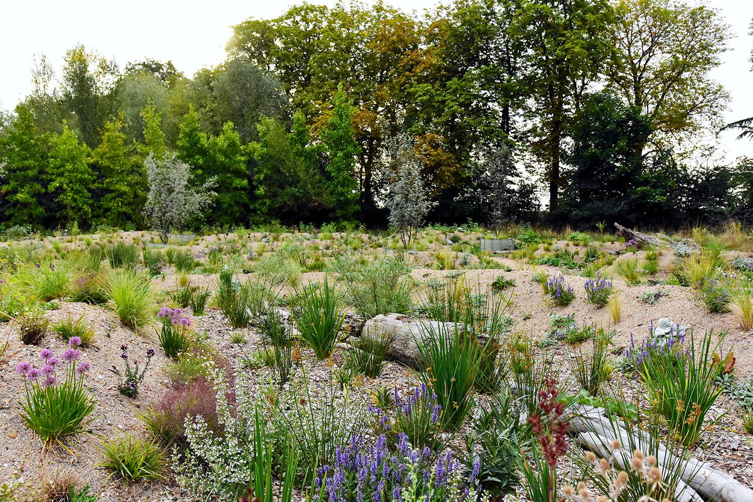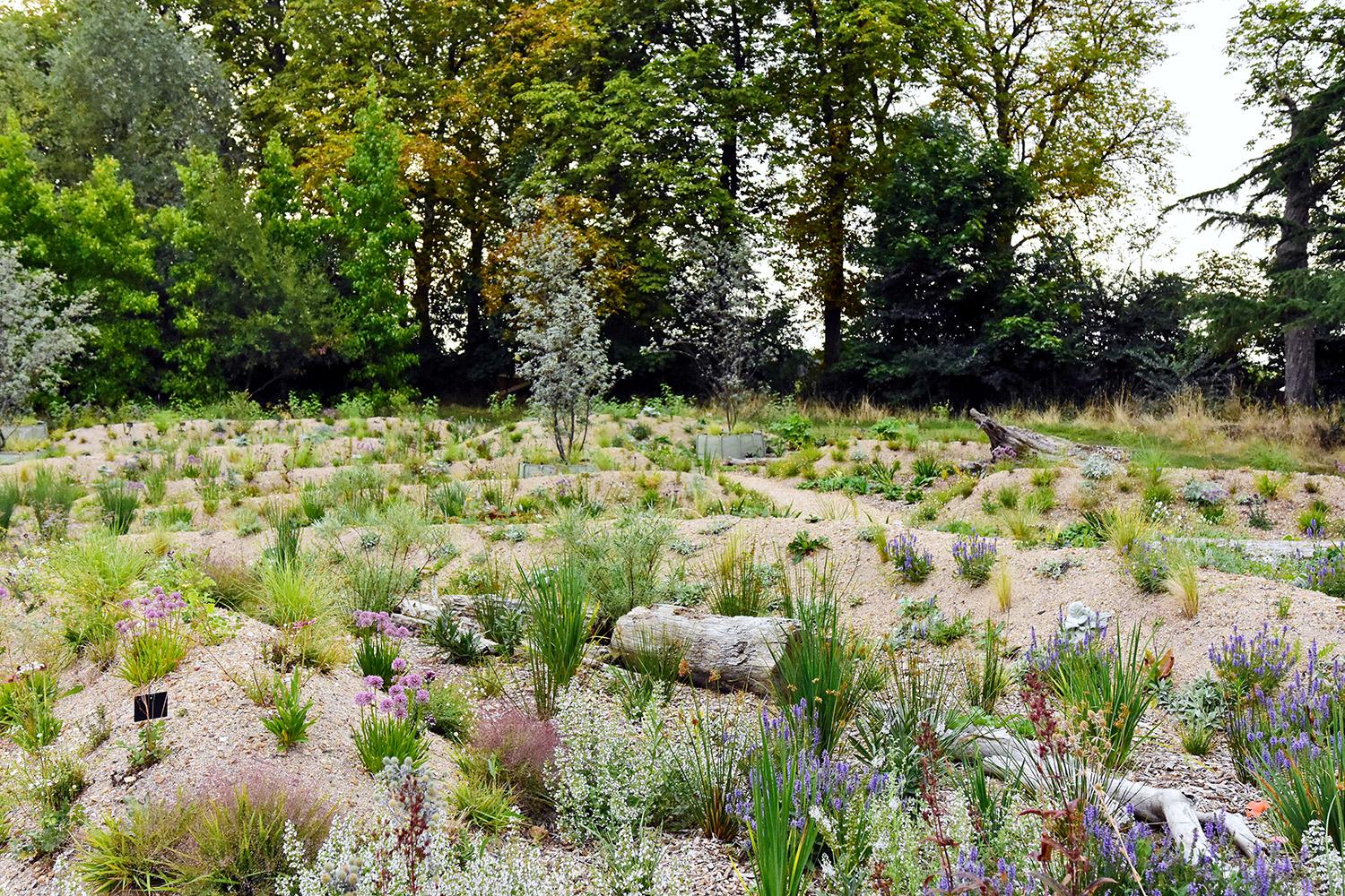 Le design explore le processus écologique de succession — la manière dont les plantes s’approprient un nouvel espace et forment des communautés végétales caractéristiques, en réponse aux conditions difficiles d’un habitat donné. Le jardin est inspiré par la dynamique de crêtes et de dépressions propre aux paysages fluviaux : les creux, riches en matière organique et en eau, favorisent la décomposition du bois, qui constitue un substrat propice à l’émergence de nouvelles plantes. Celles-ci enrichissent le sol, préparant le terrain pour les générations végétales futures. À l’inverse, les crêtes, constituées d’un substrat minéral, sec et pauvre en nutriments, accueillent des communautés végétales pionnières, issues des milieux steppiques. Au cœur du jardin, la végétation culmine dans une zone humide plantée de carex et de joncs. Avec le temps, la composition évoluera, nous invitant à observer attentivement ces transformations perpétuelles.