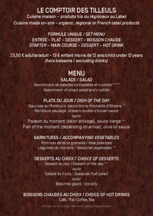 Dans un cadre bucolique, à l’abri de l’effervescence des allées et venues des promeneurs, venez vous détendre, à deux ou à plusieurs, au cœur d’un jardin, le temps d’un déjeuner sous les arbres du Comptoir des Tilleuls