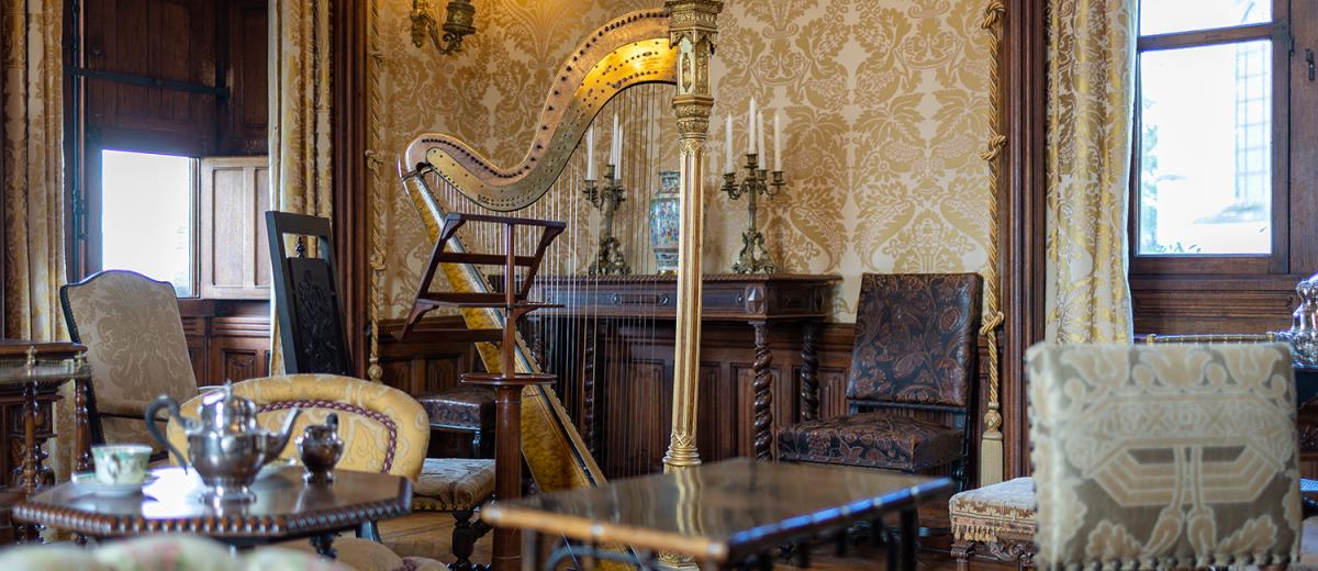 調度品としては、様式や時代の異なる、S字型ソファー、喫煙用椅子、お茶用のテーブルなどがあります。その他多くの調度品とともに、19世紀末の富裕層独特の生活の様子をうかがわせます。